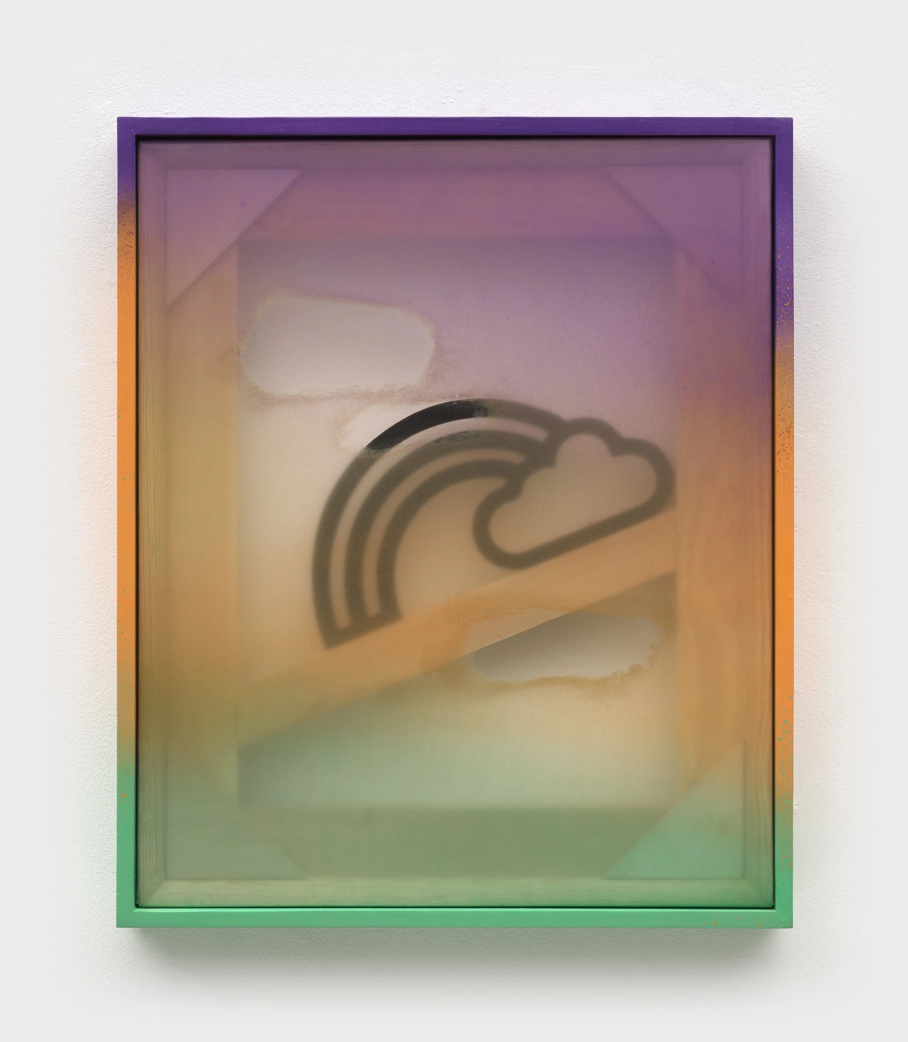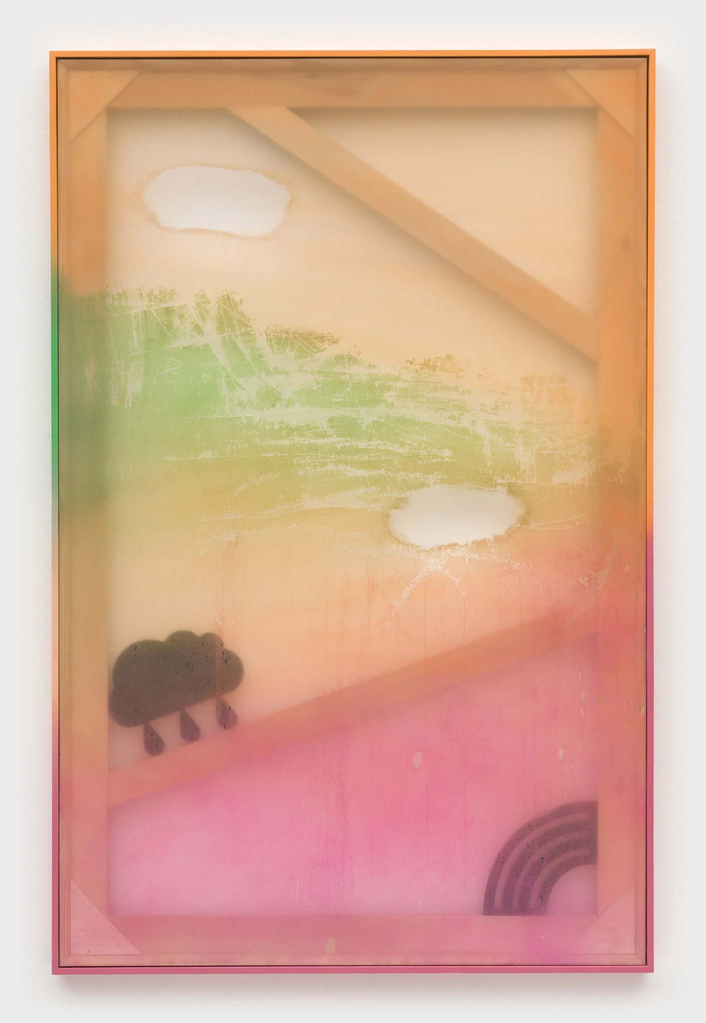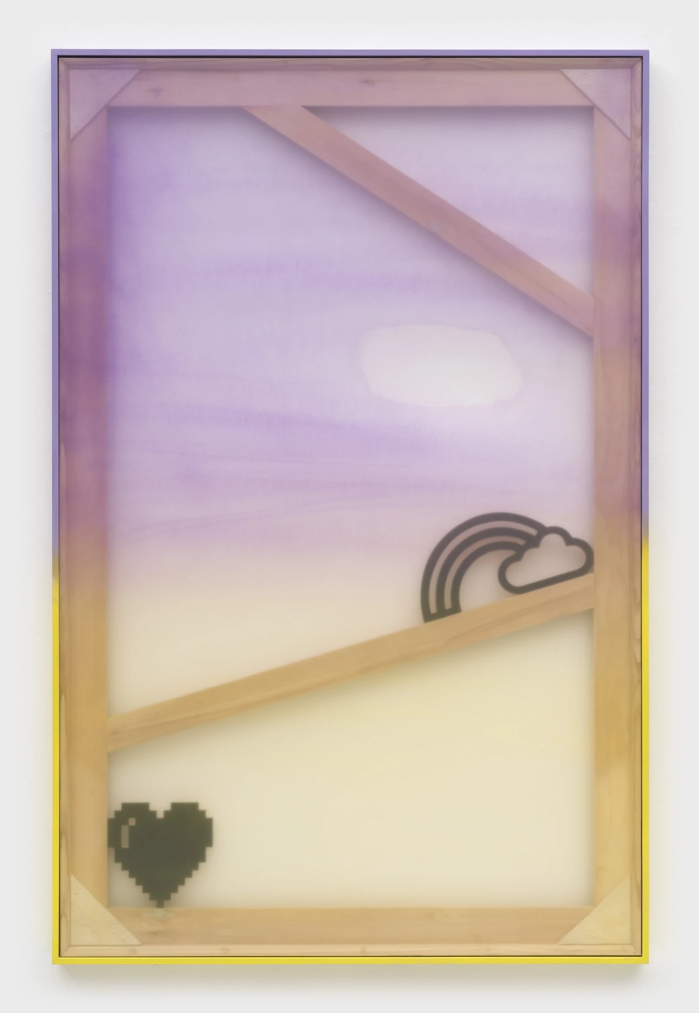 In the second iteration of Blur paintings, full color returns. In some paintings, the underlying support structure has been altered to reflect a shift, or realignment, of the foundational construction. Icons such as a pixel heart, rainbow, and palm tree are emotional touchstones, suggesting resilience, nurturing, and optimism. Transparent marine vinyl allows the "bones" of each painting to be seen, underscoring the object-ness of the series as well as a focus on rebuilding and renewal.