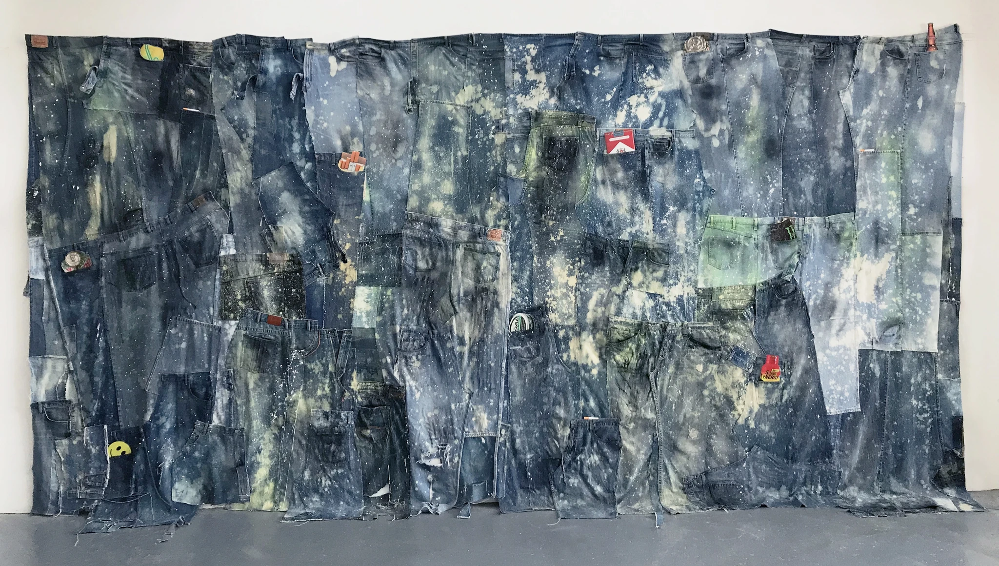 The Jeans paintings, made from deconstructed men’s denim, are a meditation on American symbolism—a rough and durable material transformed anew. In these works, denim is a stand-in for both landscape and directional brushstroke. Pollock-like splatters are a nod to canonized gestures as well as natural wear and tear, and the inclusion of colorful bands offers an atmospheric juxtaposition to what is a particularly American version of nostalgia.