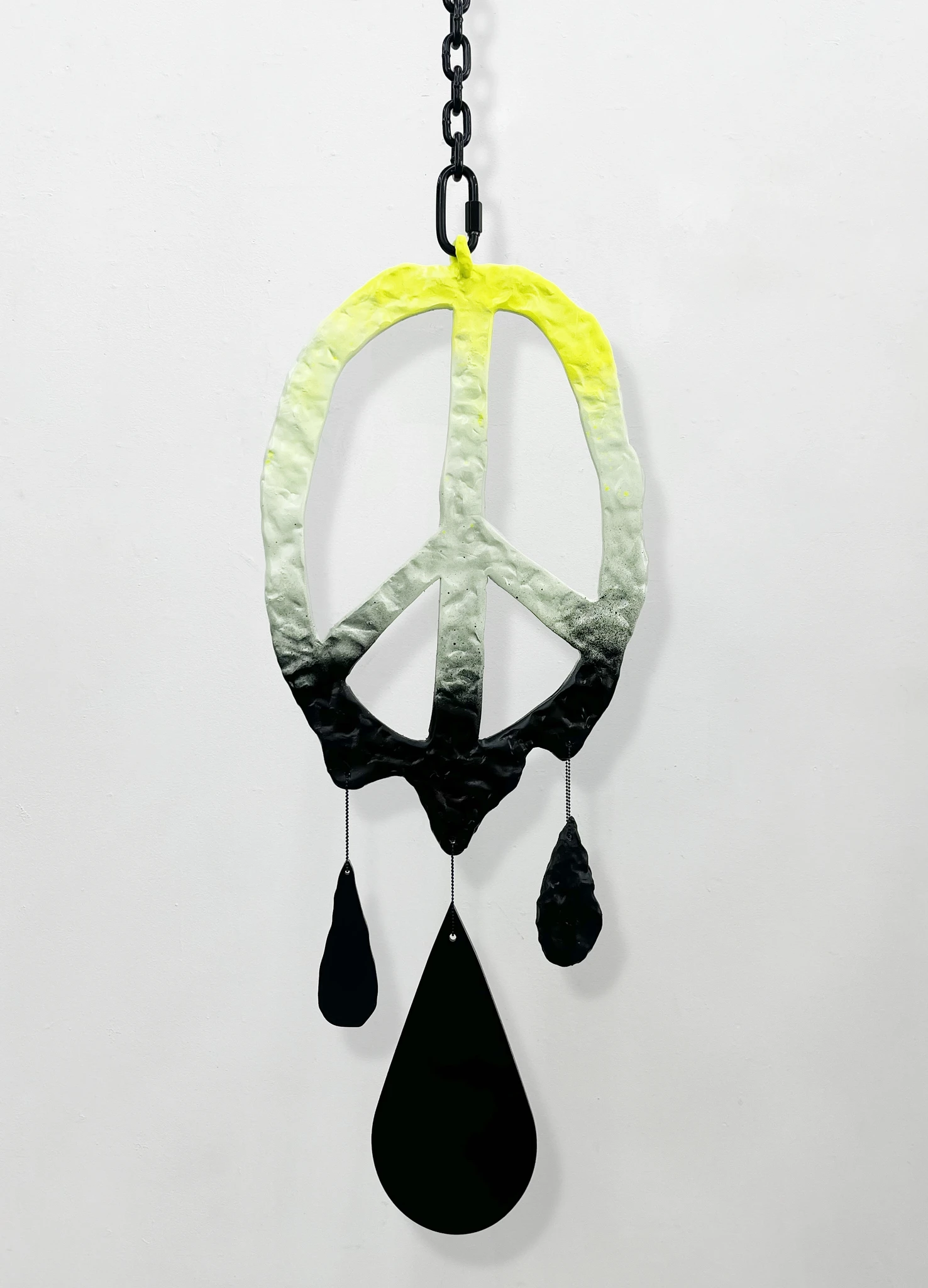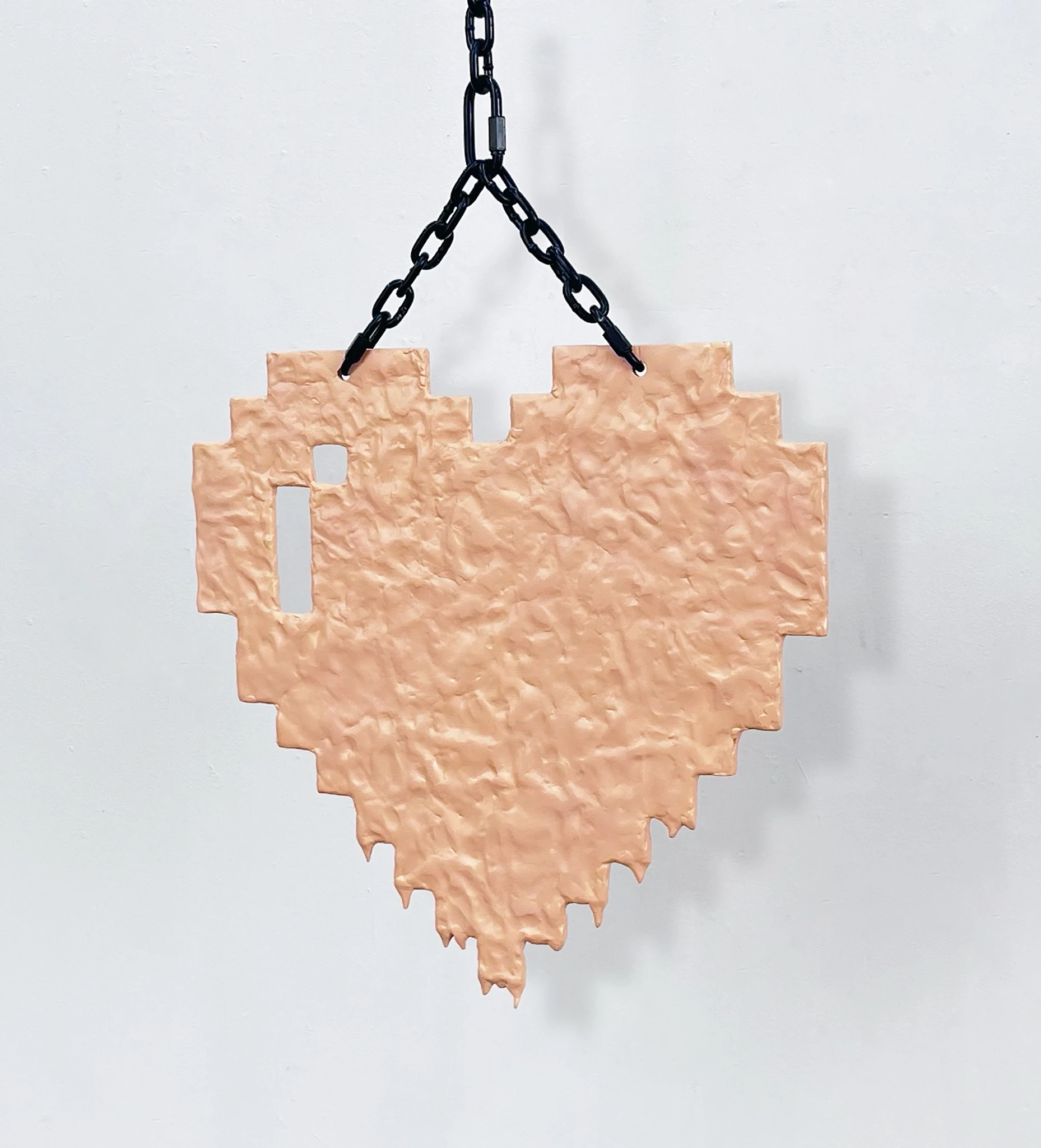 Each suspended sculpture is sculpted from epoxy resin, shows the residual marks of the hand, and dangles from an industrial chain with clean black hardware.