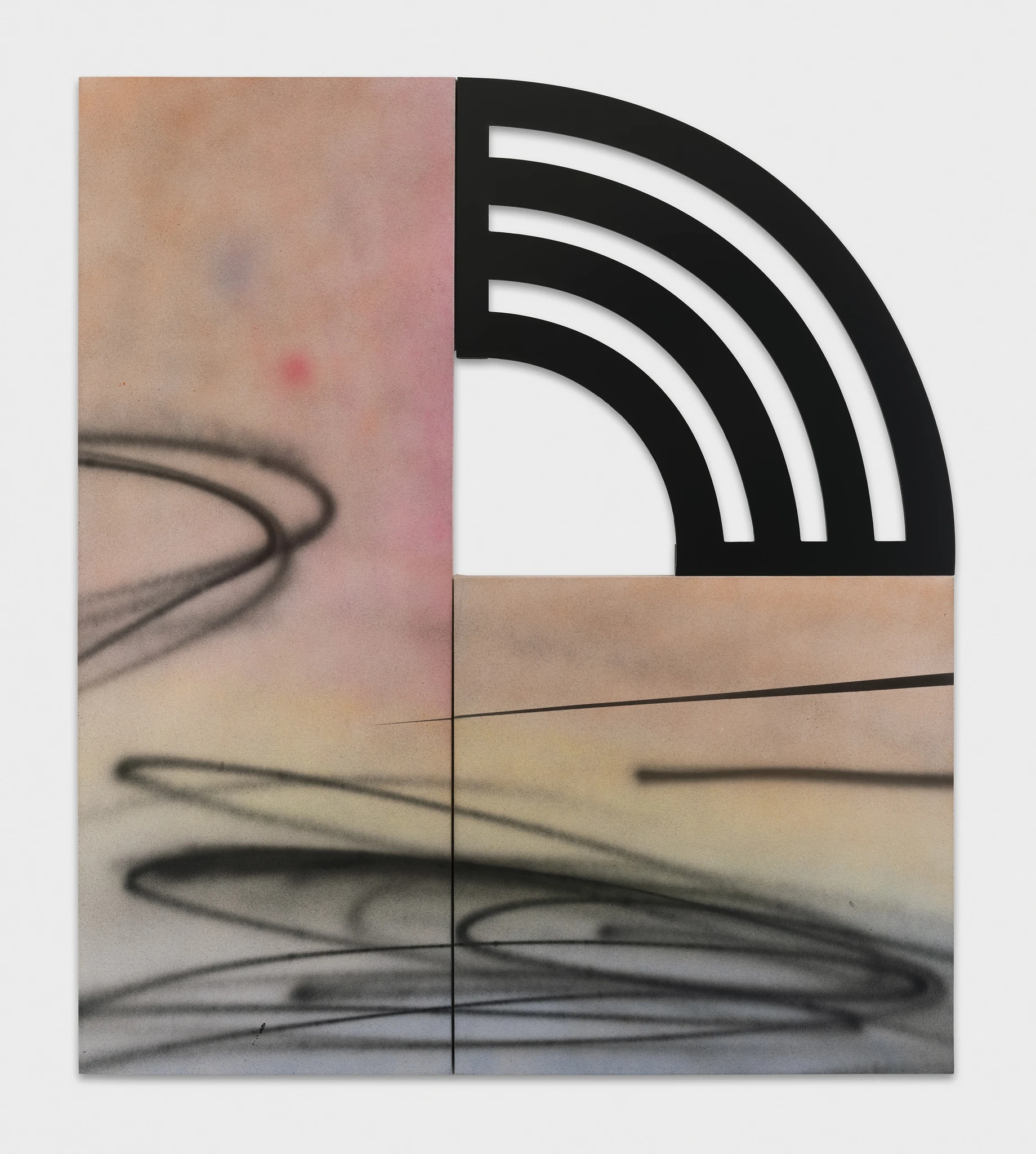 Corner Rainbows pair hard-edge rainbows with canvas panels. Some are abstract on raw canvas, while others include inkjet images that have been painted back into and layered with gestural brushstrokes, stencils, and atmospheric layers of airbrush.